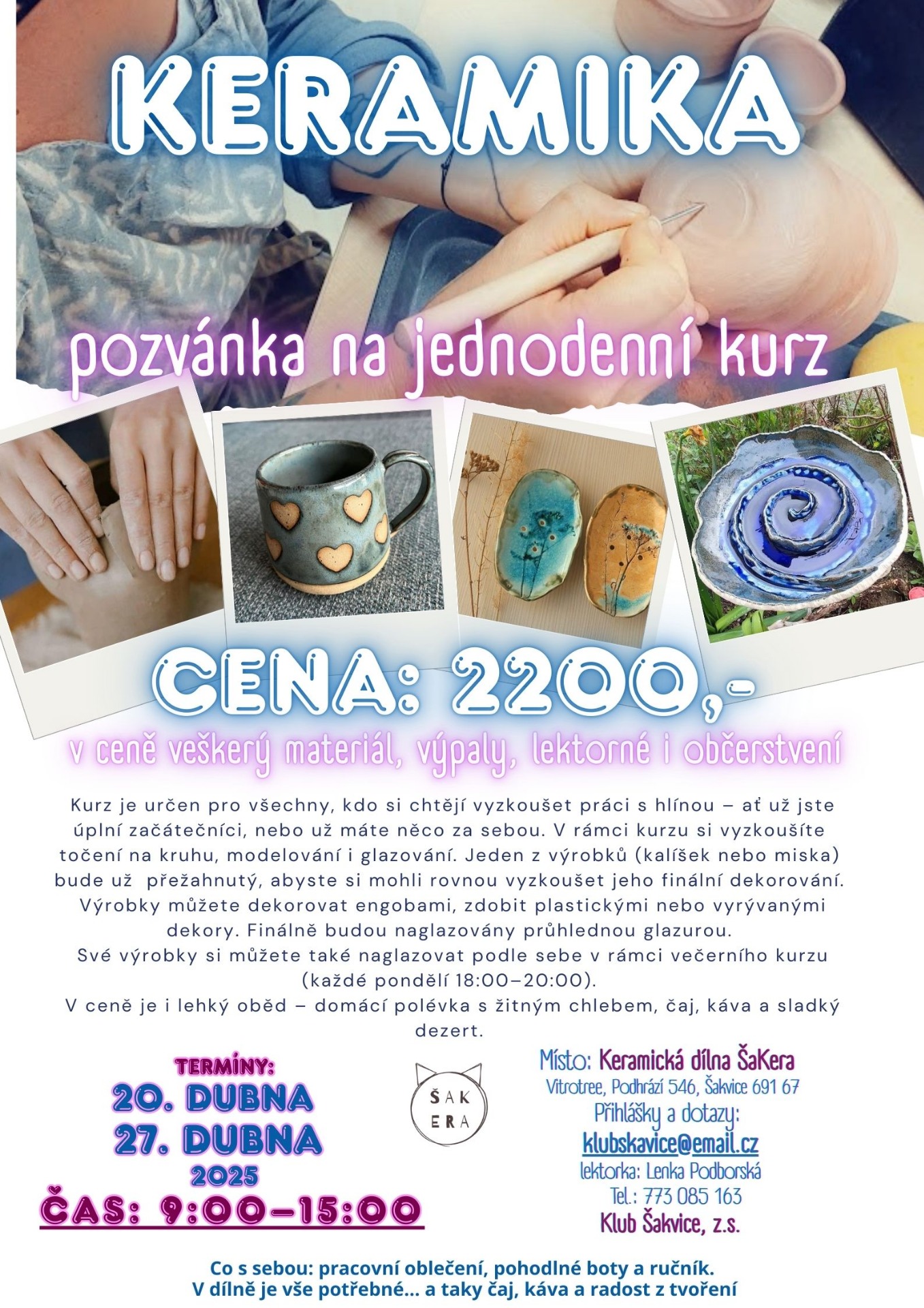 🪙 Cena: 2 200 Kč (v ceně veškerý materiál, výpaly, lektorné i občerstvení)