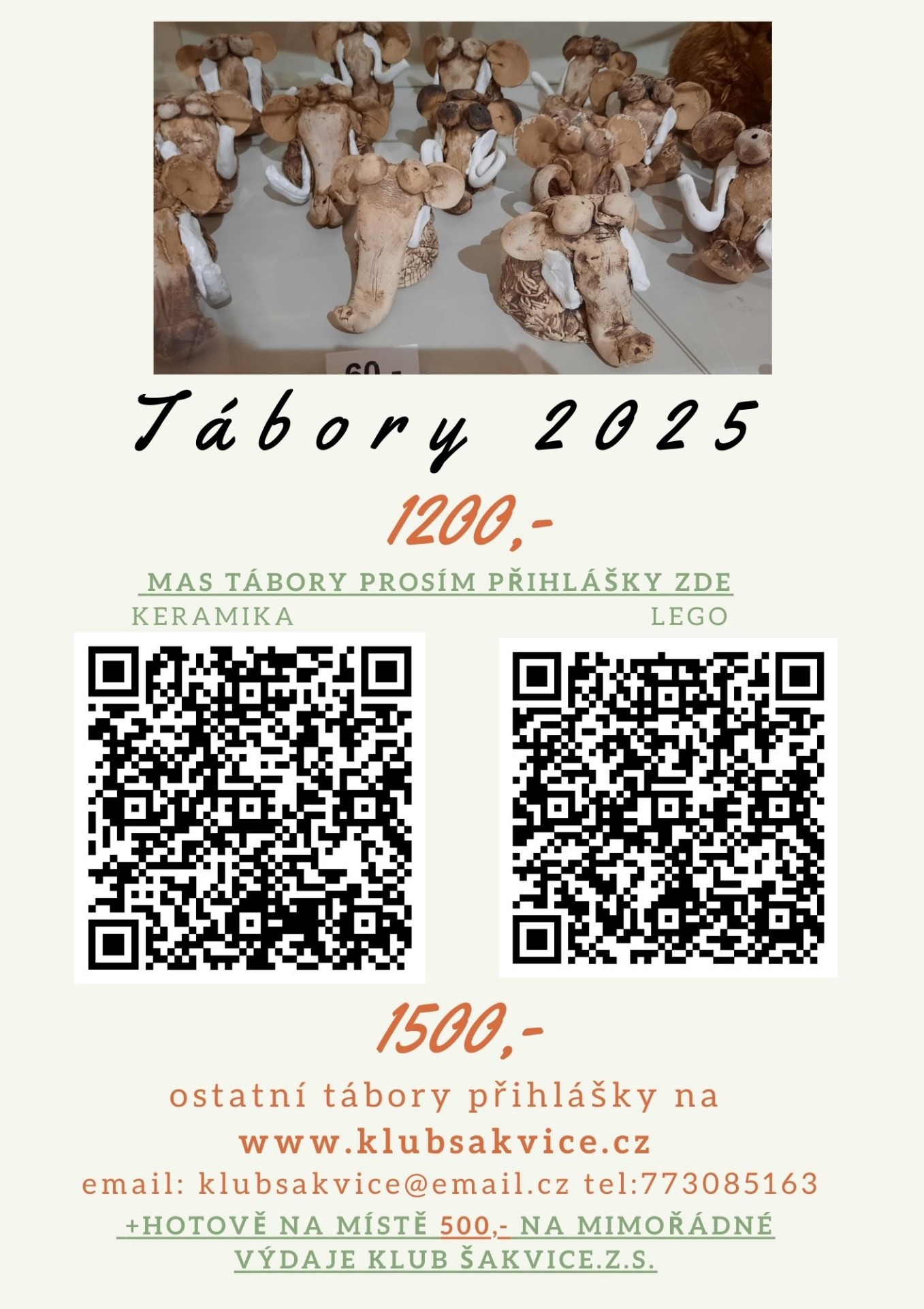 Dále vás chceme upozornit, že dva z našich táborů jsou podpořené dotací, a proto bude potřeba vyplnit trochu odlišnou přihlášku přímo pro účely dotace. Na webu jsou QR kody s přihláškami, musíte se na LEGO a KERAMIKU přihlásit tam a i platit!!